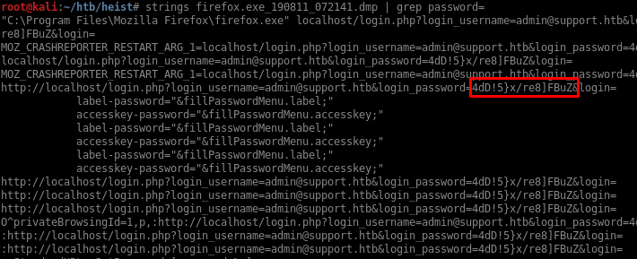 Heist starts off with a support page with a username and a Cisco IOS config file containing hashed & encrypted passwords. After cracking two passwords from the config file and getting access to RPC on the Windows machine, I find additional usernames by RID cycling and then password spray to find a user that has WinRM access. Once I have a shell, I discover a running Firefox process and dump its memory to disk so I can do some expert-level forensics (ie: running strings) to find the administrator password.