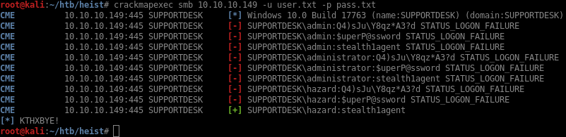 I’ll create user.txt and add the potential usernames that I have so far (admin, administrator and hazard) then do the same with passwords in pass.txt. To test all credentials, I use crackmapexec: