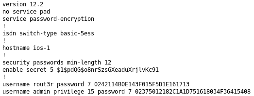 The Cisco IOS configuration file here has two different types of password hashes. Cisco uses various hash algorithms across different products and software versions. The old password encryption type is called Type 7 encryption and has been known to be extremely weak for about 20+ years now. I still see this being used in production environments every week even though it doesn’t provide any real security (it’s akin to just base64 encoding your passwords in your configs, it’s trivial to recover the plaintext).