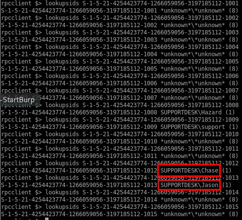 - After cracking the three passwords from the config file, we are able to use rpcclient with one of the account to recover the list of usernames