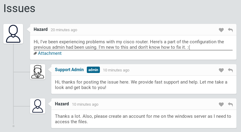 After logging in as guest, I find a Cisco configuration in the opened trouble tickets. I also make note of the Hazard username, this will be useful later.